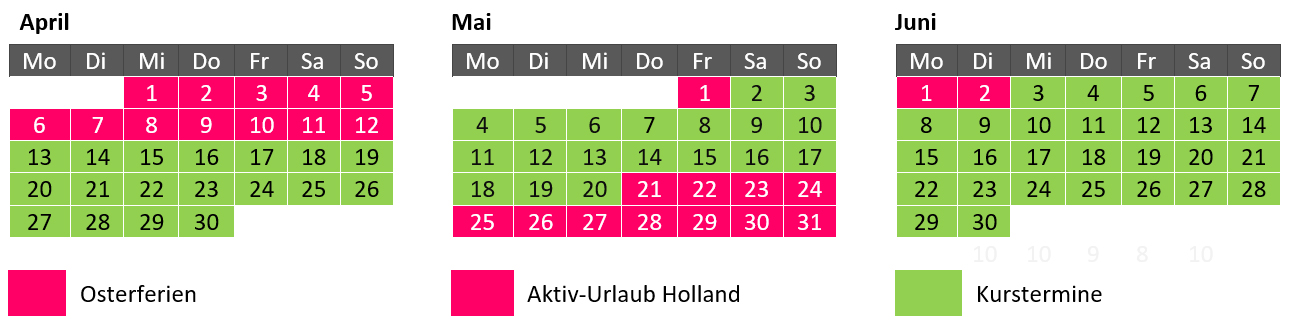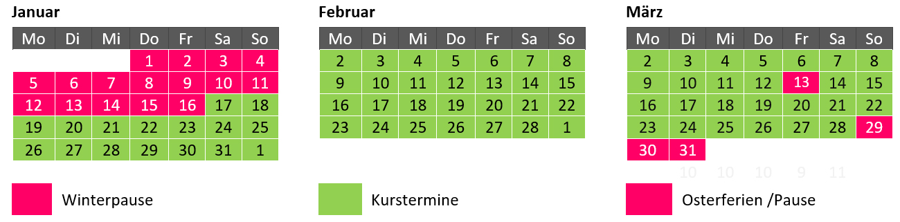 Im 1. Halbjahr 2026 finden unsere Kurse & Clubs an folgenden Terminen statt: